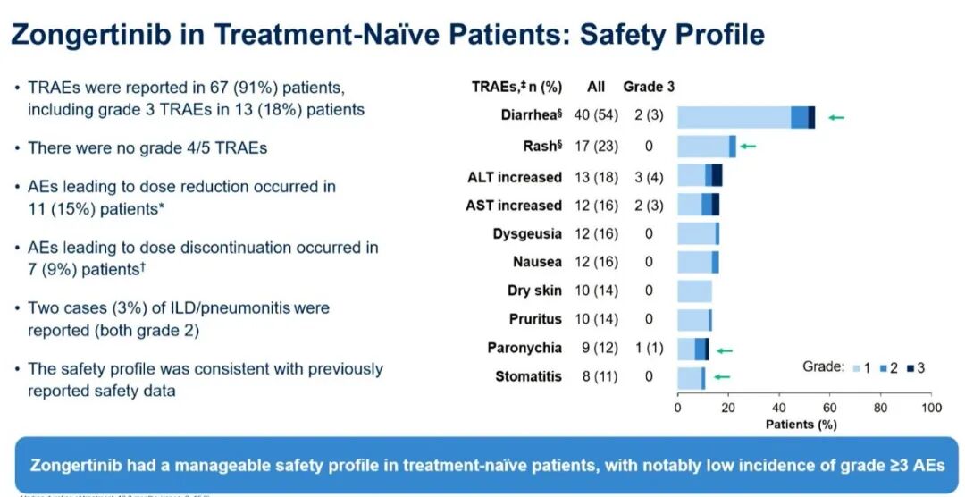 ☆在安全性方面,91%的患者报告了治疗相关不良事件,其中18%报告了3级TRAE。未报告4级或5级TRAE。共有15%的患者因AE导致剂量降低,9%的患者因AE导致治疗中止。发生了2例间质性肺病(ILD)/肺炎,均为2级。安全性特征与先前报告的数据保持一致,3级或以上AE的发生率较低。最常见的TRAE包括腹泻(54%)、皮疹(23%)、丙氨酸氨基转移酶升高(18%)、天冬氨酸氨基转移酶升高(16%)、味觉障碍(16%)和恶心(16%)。