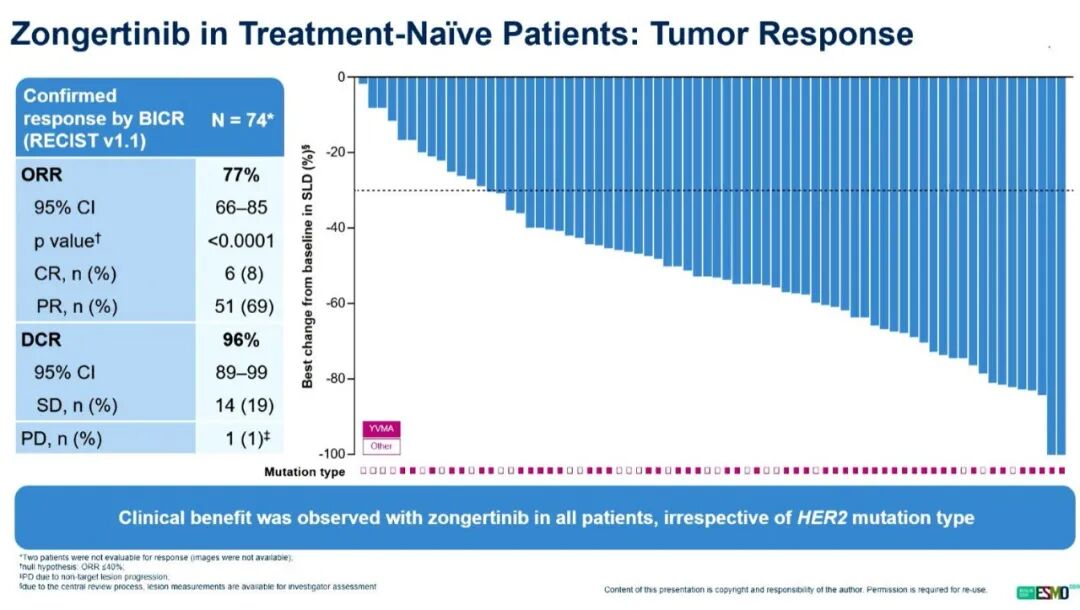 Beamion LUNG-1试验共有74名患者接受了120 mg的zongertinib治疗。值得注意的是,有2名患者曾接受过既往治疗。本次汇报重点关注的队列2纳入了初治且具有酪氨酸激酶结构域突变的患者。主要终点是通过盲态独立中心审查评估的ORR,次要终点包括通过BICR评估的疾病控制率、DOR和PFS。