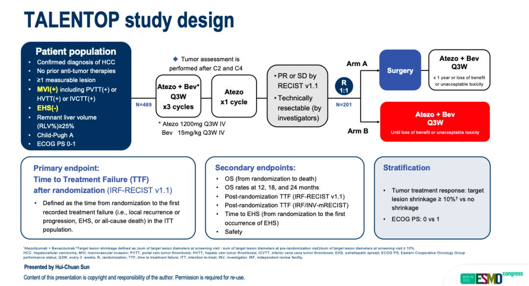 原文链接:H.-C.Sun,J.Fan,F.Shen,et al.Liver resection versus continued atezolizumab plus bevacizumab(atezo/bev)in locally advanced hepatocellular carcinoma(HCC)after atezo/bev treatment(TALENTOP):a multicenter,open-label,randomized phase III trial.ESMO 2025 Presentation No.1469MO