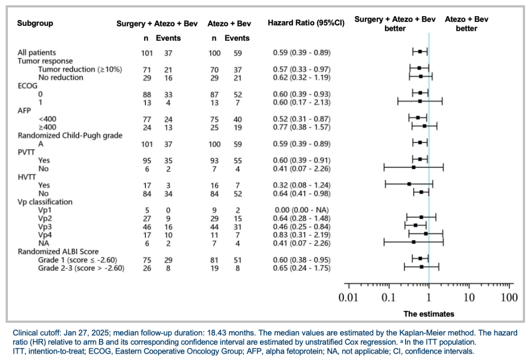 安全性上,阿替利珠单抗+贝伐珠单抗治疗毒性无特殊情况。A组治疗相关≥3级不良事件发生率为27.7%,B组为21.0%(表2)。手术相关≥3级并发症发生率21.7%,但总体风险在可控范围。
