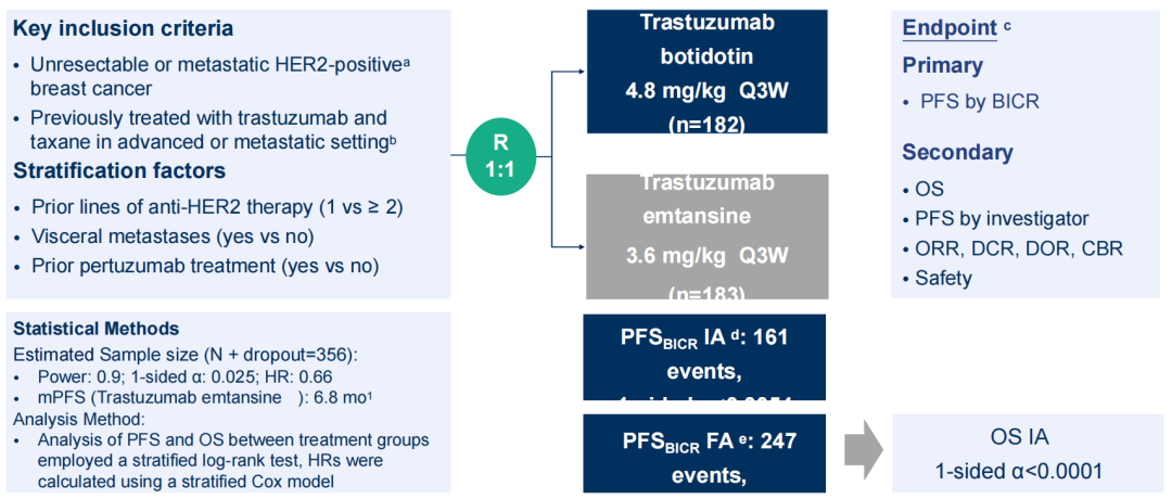 胡夕春教授:这是一项随机、开放、对照、多中心Ⅲ期临床试验,旨在评估博度曲妥珠单抗(A166)对比恩美曲妥珠单抗(T-DM1)在既往接受过曲妥珠单抗和紫杉类药物治疗的HER2阳性不可切除或转移性乳腺癌患者中的疗效与安全性。研究共筛选596例患者,最终纳入365例患者,按1:1随机分组接受博度曲妥珠单抗(4.8 mg/kg,Q3W)或T-DM1(3.6 mg/kg,Q3W)治疗,主要终点为盲态独立中心评审(BICR)评估的无进展生存期(PFS)。