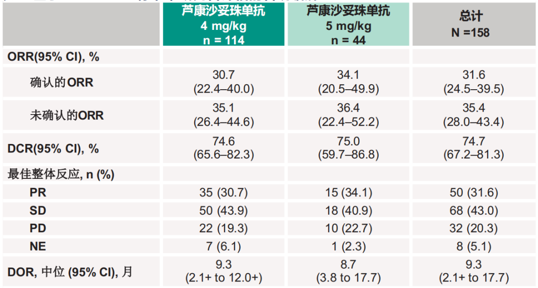 • 确认的ORR为31.6%,其中4 mg/kg组和5 mg/kg组分别为30.7%和34.1%,均为部分缓解(PR);