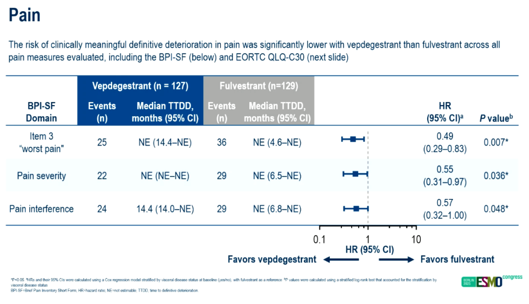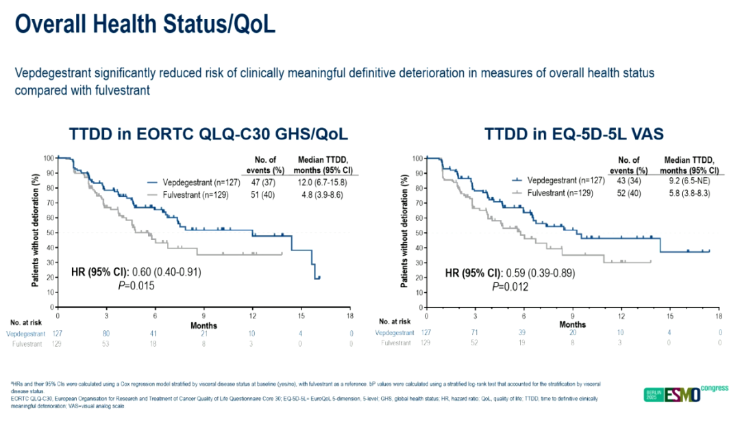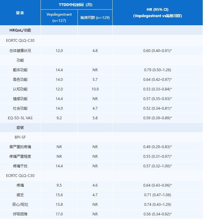 研究结果的临床意义尤为突出。一方面,Vepdegestrant与氟维司群均能维持患者健康相关生活质量(HRQoL),证实了Vepdegestrant在提升疗效的同时并未增加患者症状负担;另一方面,Vepdegestrant在PROs多维度指标的“至明确恶化的时间(TTDD)”上表现更优,意味着其能更久地延缓患者生活质量下降,这对于需长期管理的转移性乳腺癌患者而言是一项重要获益。