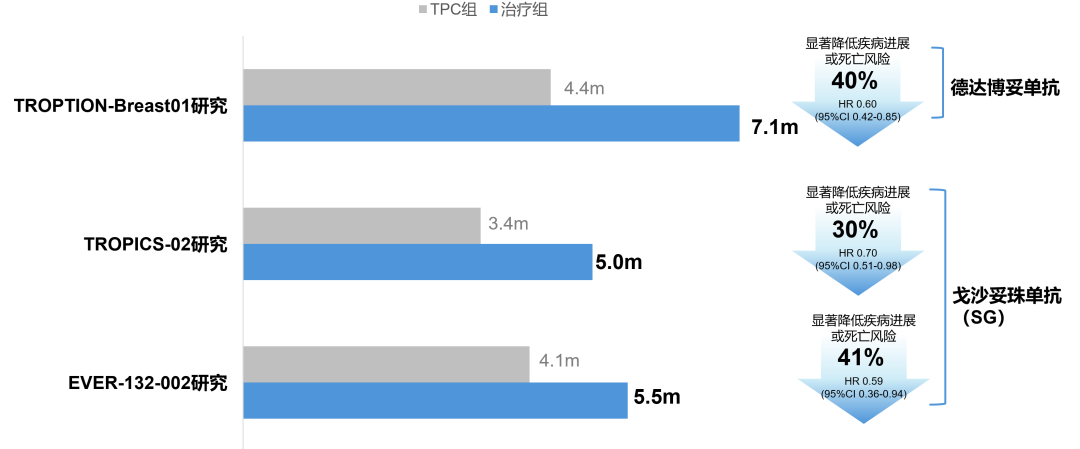 在针对HER2 IHC 0人群的疗效表现方面:TROPION-Breast01研究显示,Dato-DXd vs ICC的mPFS为7.1个月vs 4.4个月(HR,0.60,95%CI,0.42 to 0.85),显著降低40%的疾病进展或死亡风险[25]。TROPiCS-02研究中,SG vs TPC的mPFS为5.0个月vs 3.4个月(HR,0.70,95%CI,0.51 to 0.98),显著降低30%的疾病进展或死亡风险[26]。EVER-132-002研究中,SG与TPC的mPFS则为5.5个月vs 4.1个月(HR,0.59,95%CI,0.36 to 0.94),显著降低41%的疾病进展或死亡风险[18]。