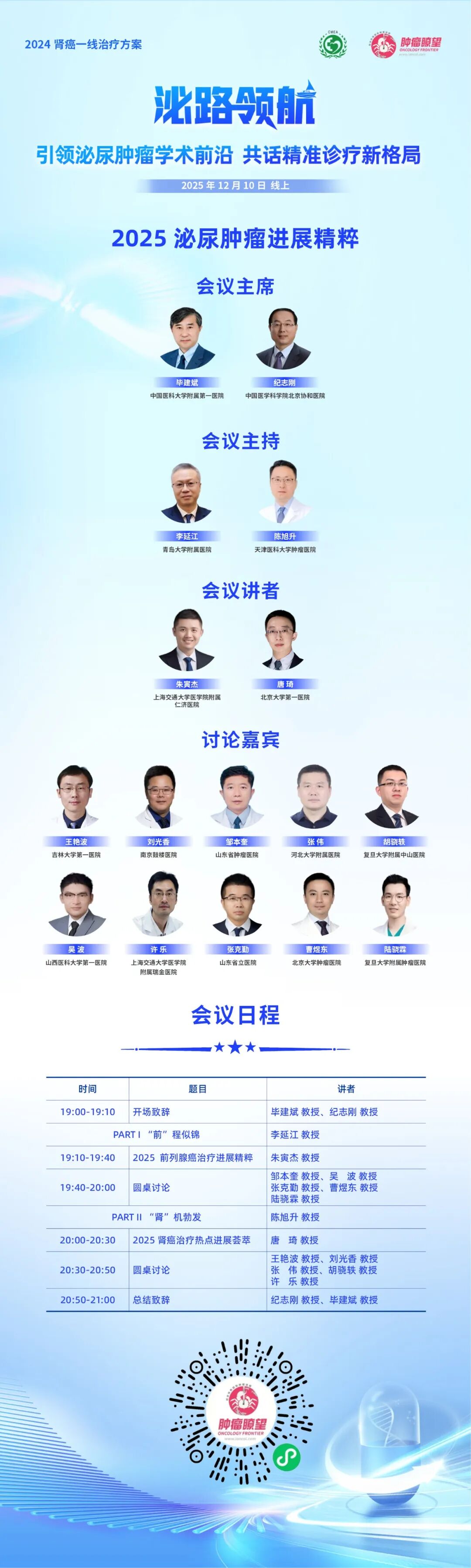 基于此,为强化前沿证据解读,“泌路领航”泌尿肿瘤线上会议应运而生,旨在以高质量学术交流引领实践创新。2025年12月9日和10日,会议将连续呈现肾癌与前列腺癌两大学术板块,汇聚全国权威专家,共同梳理2025年最新研究进展,展望泌尿肿瘤精准诊疗的未来方向。