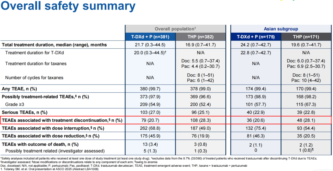 而在次要疗效终点之一的客观缓解率(ORR)方面,T-DXd+P组ORR为89.7%,其中完全缓解(CR)率为17.8%,两项数据均高于THP组(84.3%/12.8%),且T-DXd+P组患者中位缓解持续时间(mDOR)长达39.2个月,较THP组延长mDOR超过1年(26.4个月)。