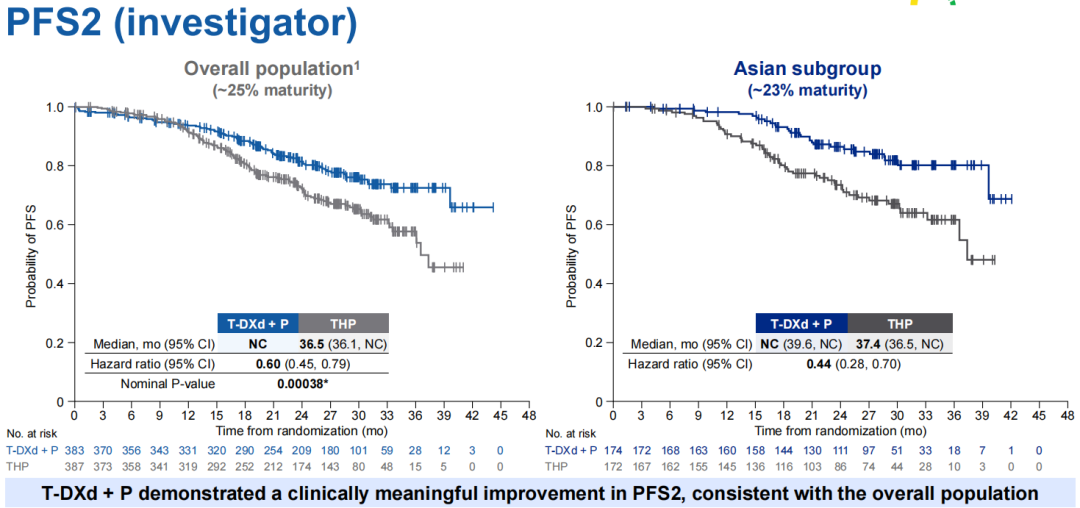 分析数据显示,T-DXd+P组和THP组亚洲患者由盲态独立中心评估(BICR)的mPFS为40.7个月和27.4个月,两组24个月PFS率为73.7%对52.8%,T-DXd+P方案使患者疾病进展或死亡风险显著下降45%(HR 0.55,95%CI:0.39-0.78),由研究者评估的mPFS也呈现一致趋势(40.7个月vs.21.5个月,HR 0.47,95%CI:0.33-0.65),上述数据呈现的T-DXd+P组获益趋势,也与研究全球人群数据保持一致(mPFS,40.7个月vs.26.9个月,HR 0.56)。