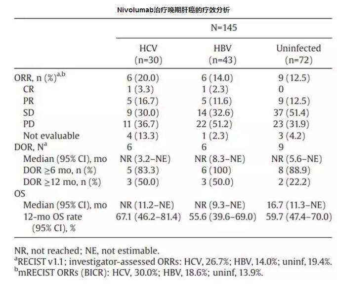 本次分析将CheckMate 040研究纳入的晚期肝癌患者分为HCV组、HBV组和未感染组,Nivolumab治疗剂量为3 mg/kg Q2W。剂量扩张期的主要终点是客观缓解率(ORR),其他关键终点还包括持续缓解时间(DOR)、总生存(OS)和疗效(基于肿瘤细胞PD-1表达情况)。