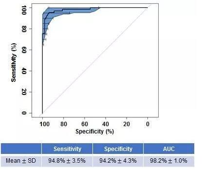 肺癌组织标本恶性分类器(malignancy classifier)的ROC曲线(色块内)