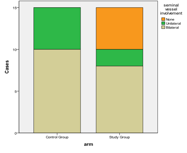 研究结果显示,接受新辅助化疗联合内分泌治疗的患者中14例达到部分缓解(PR),1例疾病稳定(SD),所有患者的PSA均下降超过90%(图1)。新辅助化疗联合内分泌治疗的最主要毒副作用为中性粒细胞下降、乏力、脱发。与对照组相比,研究组患者在Gleason评分、肿瘤负荷和精囊腺侵犯方面均有改善,其中肿瘤负荷从70%下降至20%(图2),精囊腺侵犯率从100%下降至66%(图3)。1年无生化复发率两组分别为11/15和8/15,也有下降趋势。两组在手术治疗并发症方面没有显著性差异。