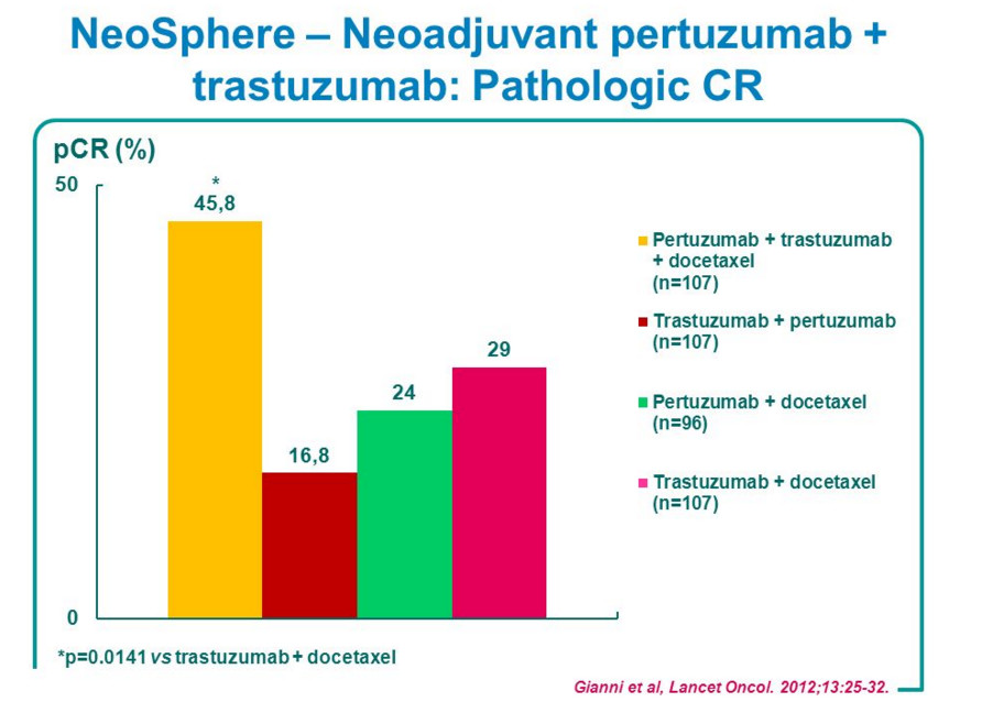 NeoSphere研究:4周期多西他赛+曲妥珠单抗+帕妥珠单抗方案达到 pCR 的比例为45.8%,明显高于其它三种方案