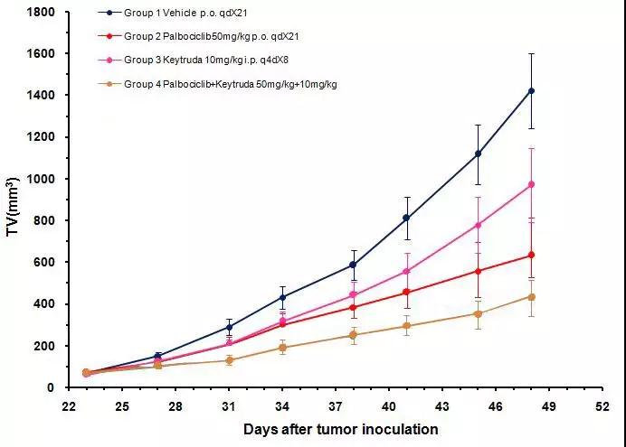 Fig4. 应用PD-1单抗及CDK4/6抑制剂联合治疗人源化PDX模型的药物敏感性。