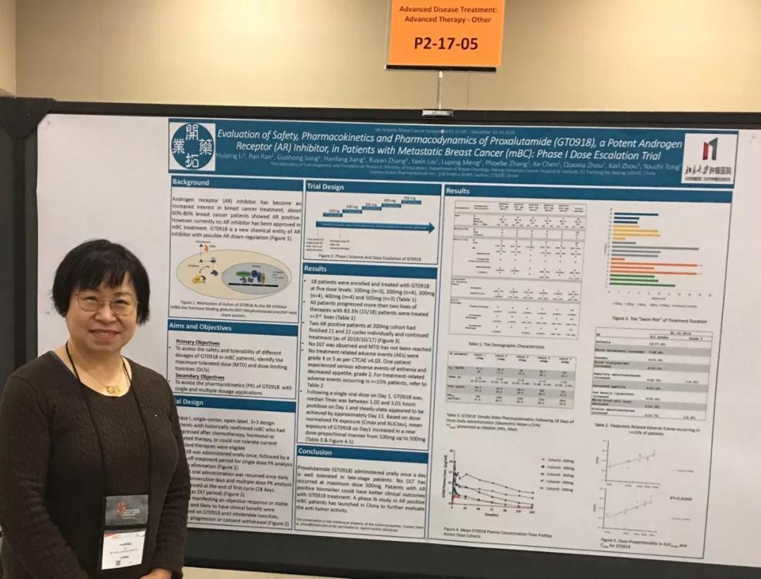 北京大学肿瘤医院李惠平教授在大会上以poster形式报告了由苏州开拓药业股份有限公司(“开拓药业”)自主研发的普克鲁胺(Proxalutamide,GT0918)针对乳腺癌适应症的I期研究结果。该研究为单中心、开放的3+3剂量递增研究,研究对象为经组织学确认的转移性乳腺癌患者,共入组18例受试者,分为每日口服100 mg,200 mg,300 mg,400 mg及500 mg共五个剂量组,其中7例受试者为雄激素受体AR阳性,7例受试者为AR阴性,其余4例未检测。所有受试者都经过二线及以上治疗,其中83.3%(15/18)的受试者接受了三线及以上治疗。