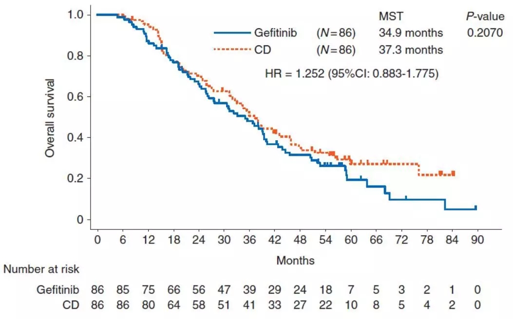患者接受随机化,两组意向性分析人群均为86例。末次随访时间为2013年9月,中位随访时间为59.1个月。整个研究队列共有73.8%的患者出现死亡事件,中位生存时间为35.5个月。其中吉非替尼组和化疗组分别有79.1%和68.6%的患者出现死亡事件。在吉非替尼组,分别有64%、9.3%和26.7%的患者出组后接受双药化疗、单药化疗及EGFR-TKI治疗(分别有2例、1例患者接受吉非替尼和厄洛替尼作为二线再挑战治疗,另有1例接受厄洛替尼续贯吉非替尼作为再挑战治疗);而在化疗组,90.7%的患者出组后接受了EGFR-TKI的治疗。两组的中位OS分别34.9个月和37.3个月,差异无统计学意义(图1)。