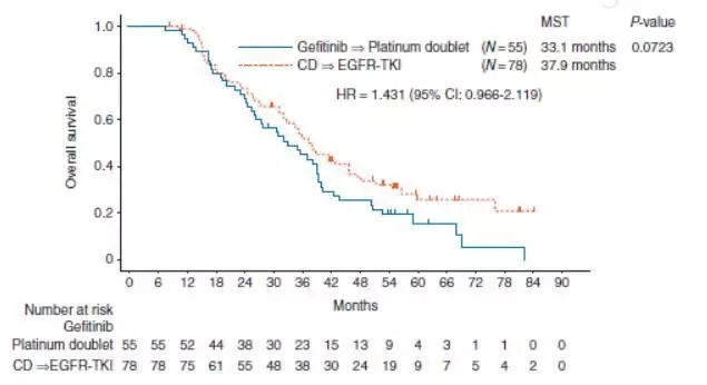 研究者基于患者治疗顺序进行了进一步分析,以确定治疗顺序对患者OS的影响。吉非替尼组有55例患者出组后接受了双药含铂化疗(A组),化疗组有78例患者出组后接受EGFR-TKI治疗(B组),两组之间的中位OS分别为33.1个月和37.9个月,差异无统计学意义(HR=1.431, 95% CI: 0.966–2.119, P=0.0723)(图3),但携带19del的患者首先接受化疗,进展后续贯吉非替尼治疗显示了有统计学意义的OS提高(31.8个月 vs. 41.6个月, HR=1.752, 95% CI: 1.001–3.065, P=0.047),但在携带21L858R突变的患者中,并未观察到这一趋势(HR=1.118, 95% CI: 0.630–1.985, P=0.703)。