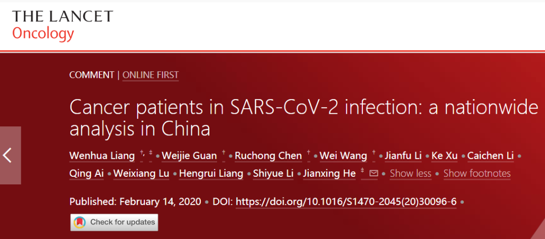 2020年2月14日,广州医科大学第一附属医院何建行课题组在《柳叶刀肿瘤学》在线发表了题为“Cancer patients in SARS-CoV-2 infection: a nationwide analysis in China”的文章。该研究是此次新冠肺炎疫情爆发以来,首次对中国新型冠状病毒(SARS-CoV-2)感染的癌症患者临床特征进行详细分析。