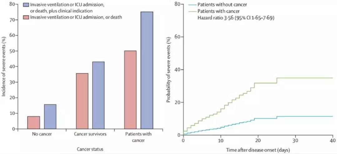 图:(左)非癌症、癌症幸存者、癌症患者的严重事件发生率;(右)癌症和非癌症患者严重事件概率的时间依赖性