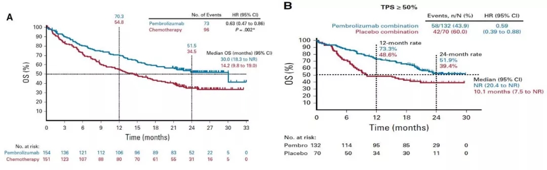 图1. KeyNote-024(A)和189研究中PD-L1≥50%患者(B)的OS
