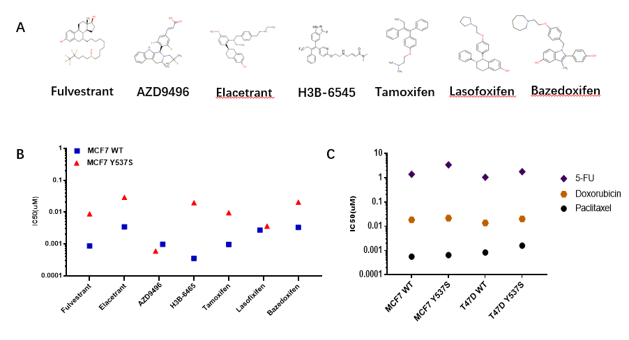 图2. ESR1 Y537S突变分别对内分泌和化疗药物的敏感性(图2A:乳腺癌内分泌治疗药物结构;图2B:内分泌药物在MCF7和MCF7 Y537S突变中的IC50;图2C:化疗药物在MCF7和MCF7 Y537S突变中的IC50)