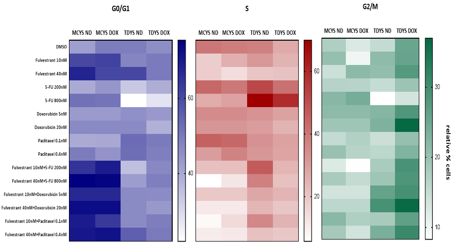 细胞周期实验显示在P53野生型的MCF7与MCF7 Y537S细胞系中,氟维司群与化疗联合具有更高的G0/G1期阻滞(图4)。