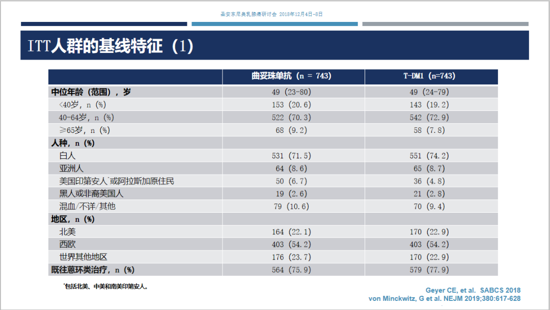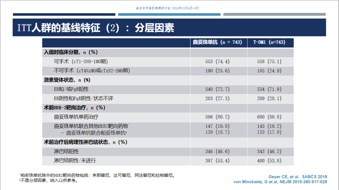 研究背景:HER2阳性早期乳腺癌新辅助化疗联合抗HER2靶向治疗后有残存浸润性病灶的患者,其疾病复发和死亡风险更高。KATHERINE研究旨在评价以T-DM1替代曲妥珠单抗作为新辅助治疗后有残存病灶患者的辅助治疗方案。