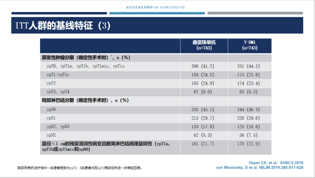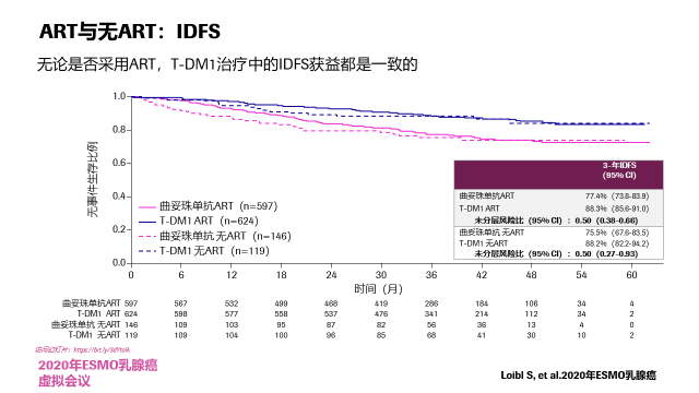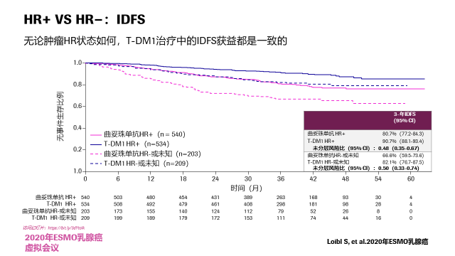 在今年的ESMO-Breast cancer会议上,我们报道了这样一个结果,对KATHERINE研究中新辅助治疗后non-pCR患者的手术标本重新进行免疫组化检查发现,在70例残留病灶HER2检测阴性的患者中,42例随机分配接受曲妥珠单抗治疗的患者发生了11例IDFS事件(IDFS~74%),28例随机分配接受T-DM1治疗的患者发生了0例IDFS事件,这再次证明了这些患者是可以从T-DM1的研究中获益的,与我们之前的试验结果是一致的,这对于临床是很有意义的结果。