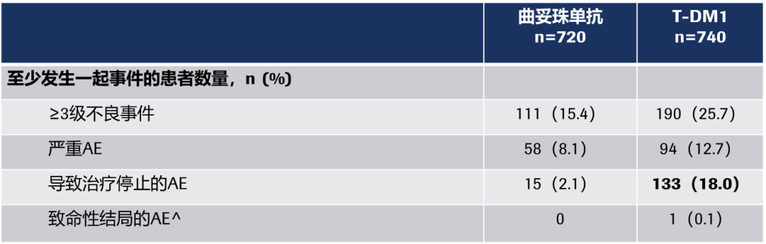 在安全性方面,总体上来说,大部分患者还是耐受的。对于因AE而停止治疗的患者,我们对于停药标准的把控是非常严格的,对于实验室指标异常的患者我们进行了停药,导致没能完成最终的治疗,但这部分患者并未出现真正的临床症状;对于血小板降低的患者,我们也是能够进行很好的管理的,所以这个药物的耐受性总体上是良好的,对于考虑使用T-DM1的患者,不应该受到这样一些AE的顾虑和影响。