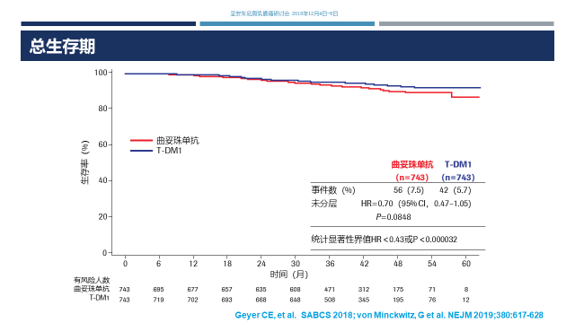 总生存:最后来看一下目前总生存的分析,曲妥珠单抗vsT-DM1组的事件数是56 vs 42,未分层风险比是0.7,当然我们还需要进一步随访,等待OS的成熟。