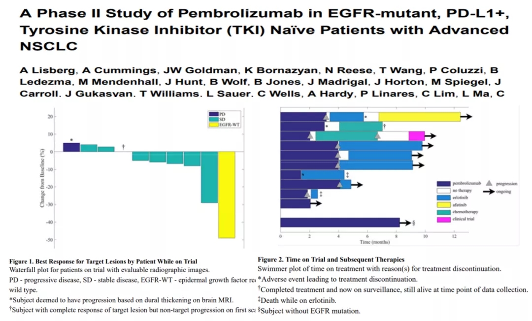 在KEYNOTE-001试验中,EGFR突变阳性且PD-L1≥1%的患者先接受PD-1治疗,PD-1疗效更好。但上述数据仅来源于单中心回顾性研究,且样本较小。为进一步确认上述研究的可靠性,A.Lisburg等进行了一项前瞻性II期临床研究。共招募了11名未接受靶向治疗的EGFR突变患者,其中64%为EGFR敏感突变,并且73%的患者为PD-L1表达强阳性.结果显示PD-1疗效几乎为0%!而且影响了后续治疗效果,最终研究提前终止。所以尽管研究数据较少,对于没有接受靶向治疗的EGFR突变晚期非小细胞肺癌患者,即使PD-L1表达超过50%,还是应该首选靶向治疗。