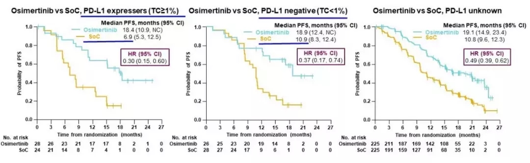 至此,PD-L1高表达与EGFR-TKI原发耐药的关系日渐明朗,EGFR-TKI及ICIs似乎对于此类人群均束手无策,难道“王炸”就此变“青铜”?当然不会!FLAURA研究的亚组分析中我们发现奥希替尼一线靶向治疗疗效并不受PD-L1表达的影响,即便在PD-L1高表达组仍然与总体人群获益保持一致。现有研究结果提示奥希替尼在体外实验中能够降低PD-L1 RNA及蛋白水平的表达,重新激活T细胞的免疫活性。所以对于晚期“王炸”突变患者,一线EGFR-TKI靶向治疗仍然是首选,而其中奥希替尼优势显著。然而,个别情况下也不能忽视C+T及A+T联合模式的作用,尤其是EGFR敏感突变合并有高TMB、脑转移、胸腹腔积液等特殊情况的患者,更应择适而选。