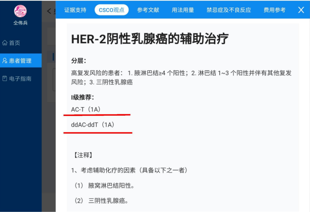 AI系统给出的治疗方案分别依据哪些询证医学证据呢?CSCO指南中的观点是什么?这些追问,系统也已显示出了答案。CSCO AI会根据患者的疾病特征,推荐不同级别的治疗方案,这种治疗方案也与CSCO BC指南相吻合。与此同时,当笔者想要了解方案背后的数据,只需要点击详情按钮,从而获得证据支持、CSCO观点、参考文献、用法用量、禁忌症、不良反应、费用参考等信息,关于这位患者规范治疗的所有询证依据也了如指掌了。