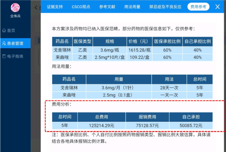 在2020年CSCO AI进行了重要更新,增加了费用参考,比如在笔者选择辅助内分泌治疗时,该系统可以迅速告知患者每个周期所需的费用,自付比例,以及完成治疗所需自费的费用,帮助患者根据自身条件选择最佳的治疗方案,提高治疗的延续性。