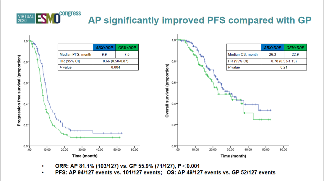 本研究共纳入254例患者,AP组和GP组各127例。中位随访16.3个月后,结果显示,AP组患者的中位PFS为9.9个月,GP组为7.5个月(HR=0.66;95%CI:0.50~0.87;P=0.004)。AP组的ORR显著高于GP组(81.1% vs 55.9%;P<0.001)。AP组中位OS较GP组有数值上的延长(AP组26.3个月,GP组22.9个月;HR=0.78;95%CI:0.53~1.15;P=0.21)。安全性方面,在3或4级不良事件中,AP组神经毒性的发生率高于较GP组(AP对比GP,18.8% vs 0%),而血小板减少低于GP组(AP对比GP,3.9% vs 29.4%)。严重不良事件发生率两组相似,AP组为3.9%(5/127),GP组为2.4%(3/126)。没有发生治疗相关性死亡。