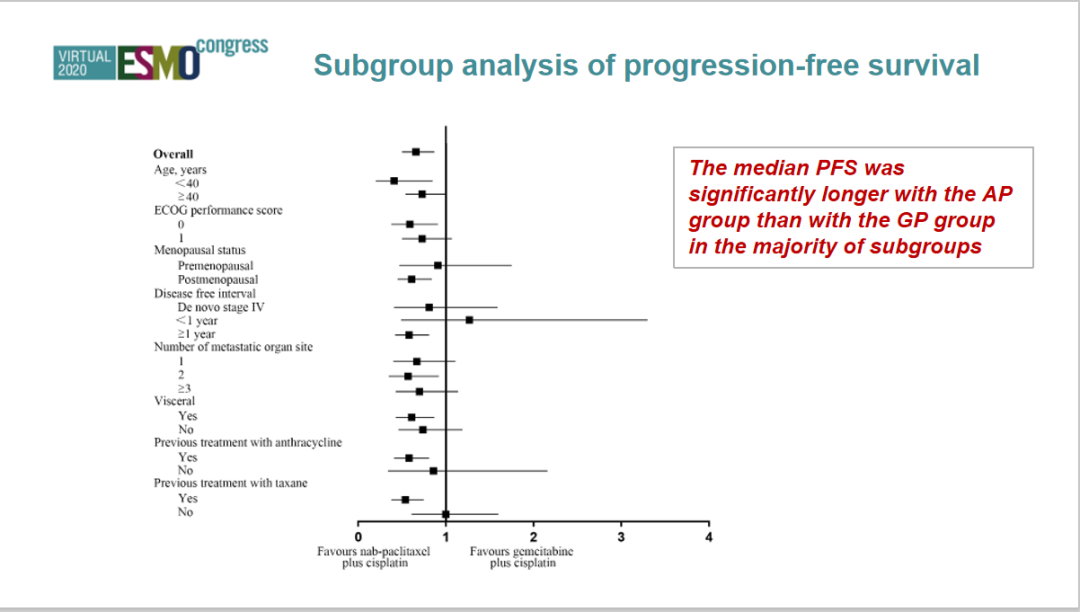 国外的著名临床研究——IMpassion 130研究的对照组标准治疗是白蛋白紫杉醇单药,我个人并不认同这是三阴性乳腺癌的一线最佳标准治疗方案,我们的系列研究证明了以铂类为基础的方案,尤其GP/AP应当作为一线mTNBC治疗的推荐化疗标准方案。在目前化疗联合靶向或者免疫治疗的研究大潮中,AP也可作为联合新的靶向或者免疫药物的基础化疗骨架方案,在AP的基础上联合PD-1单抗、PARP抑制剂、抗血管生成等靶向药物,也许能进一步增加一线mTNBC患者的获益,目前我们中心也已经开始了在AP基础上联合其他治疗的进一步探索。