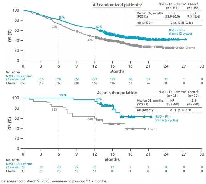 而此次公布的亚裔患者数据显示,亚洲亚组共计245例患者,分别有121例、124例随机至Nivo+ipi组和化疗组。数据显示: