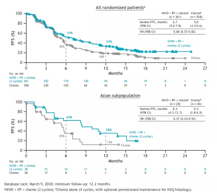 亚洲亚组共入组58例亚裔患者,免疫联合治疗组和化疗组分别有28例和30例。此次公布的数据显示: