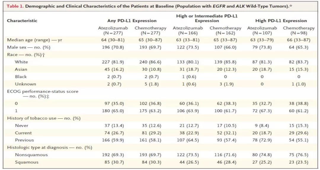 符合入组标准的患者按照1:1的比例,随机分为Atezolizumab(1200 mg,静滴)或铂类药物为基础的4~6周期化疗,治疗每三周进行一次。在化疗组,非鳞癌非小细胞肺癌患者接受顺铂(75 mg/m2)或卡铂(AUC=6),联合培美曲赛(500 mg/m2)的治疗;在鳞状非小细胞肺癌患者中,选择顺铂(75 mg/m2),联合吉西他滨(1250 mg/m2)或卡铂(AUC=5)联合及吉西他滨(1000 mg/m2)的治疗。