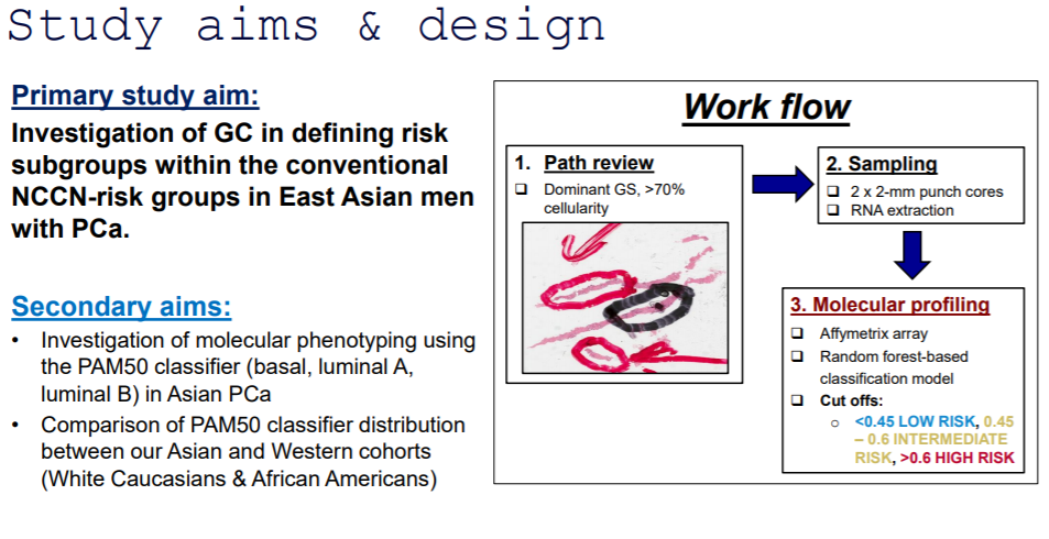 编者按:由于存在人种差异,亚洲人群PCa发生过程不同于欧美人群。因此,二者的预后预测及诊断也存在一定差异。在ESMO Asia 2020大会上,一项迷你口头报告(摘要号:218MO)对22-基因的基因组分类(GC)与NCCN危险分层进行了比较,以建立更适用于亚洲患者的风险分层诊断模型。《肿瘤瞭望》特邀复旦大学附属肿瘤医院朱耀教授对该项研究进行了点评。