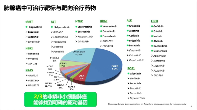 目前在临床实践中,约2/3的非鳞NSCLC患者可以找到明确的驱动基因,尤其是目前随着cMET、RET、NTRK等靶点的药物陆续上市,这些靶点也成为了持续关注的热点。