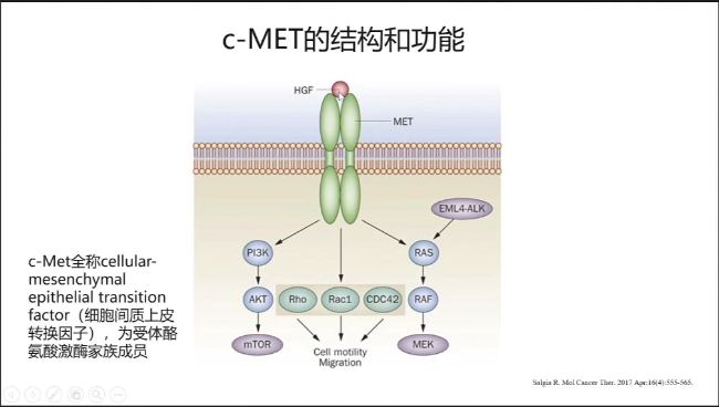 ①MET基因,作为酪氨酸激酶家族重要成员之一,其科技获多个上下游通路,在肿瘤发生中起到了十分重要的信号传导作用。在NSCLC中MET突变的表现形式多种多样,包括MET 14跳读、扩增以及重排等,但在不同亚型中,发生比例不同。如腺癌中只占到3%-4%,但肉瘤样肺癌以及EGFR TKI耐药的患者中突变比例则成倍增加。其中MET 14跳读是业界较为关注的突变之一。