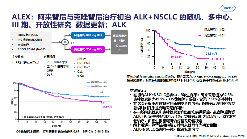 今年同时也更新了ALEX研究5年随访研究。相较于克唑替尼,阿来替尼ALEX研究的OS仍未达到终点,从生存曲线来看,阿来替尼的中位治疗持续时间几乎是克唑替尼的3倍,也因此这些结果继续支持阿来替尼作为初治晚期ALK+NSCLC患者的一线、优选标准治疗。