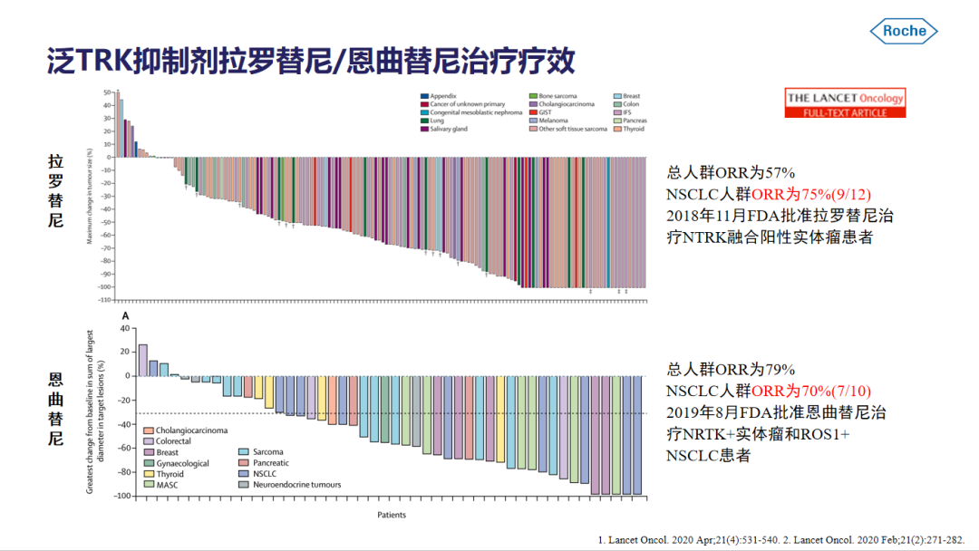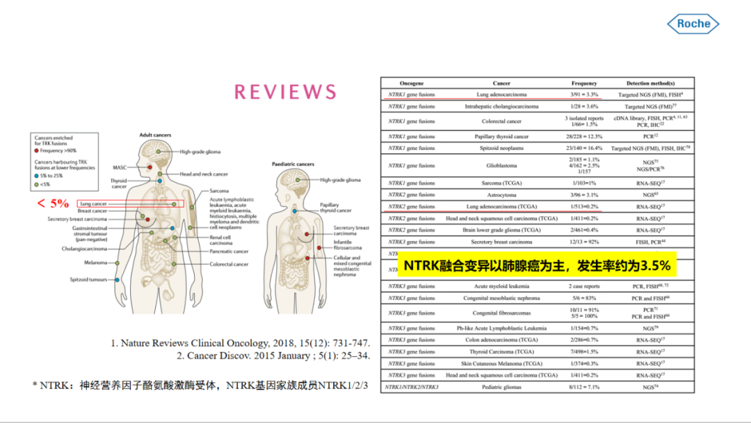 ③NTRK基因,这一突变形式较多,在NSCLC中大多表现为NTRK与伴侣基因的融合,而这一突变点位由于存在的瘤种叫我广泛,因此FDA也批准了相关药物用于NTRK融合的实体瘤治疗。