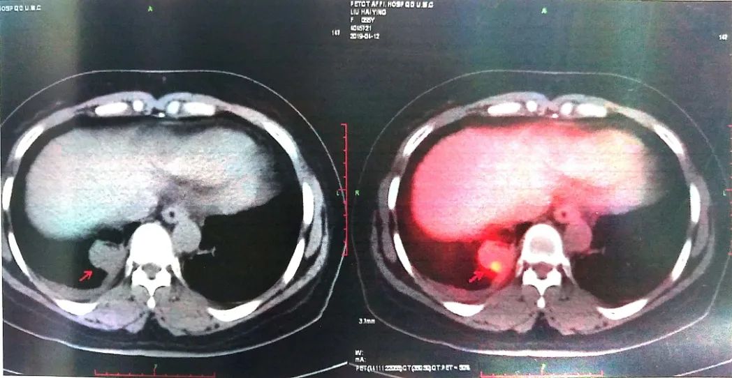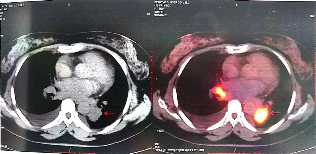 2019-04-12 PET-CT显示①右肺下叶后基底段胸膜下软组织密度肿块(大小26*30mm)。