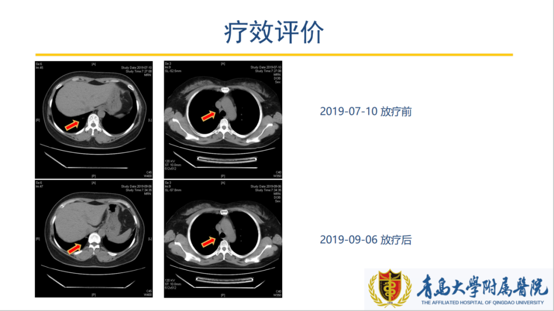 化疗:(2019-06-20、2019-07-11、2019-09-06)EP方案,剂量同前放疗:(2019-07-19至2019-08-23)范围:右肺下叶肿块、纵隔及右锁骨上淋巴引流区射线:质子,处方剂量:DT=CTV4500cGy/30f 加量:6MV-X线,弧形调强,DT=2250cGy。