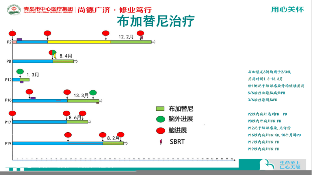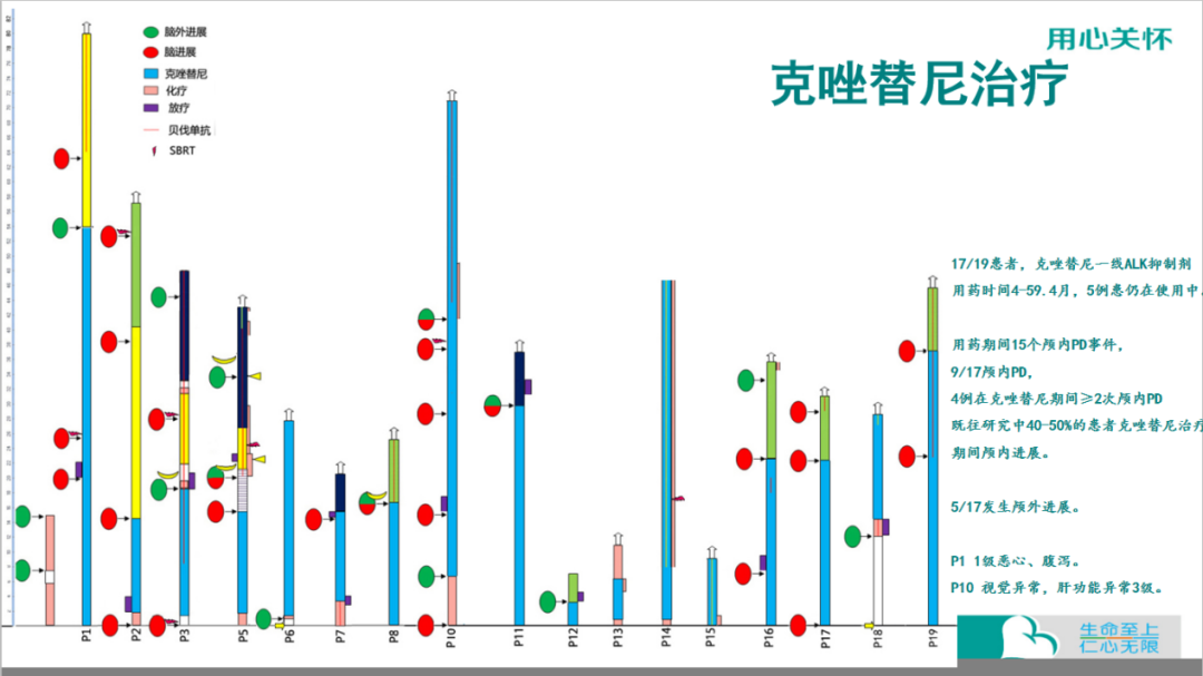 大部分患者一线治疗为克唑替尼,然而不少患者在用药期间出现颅内进展(15/19)也因此患者一线治疗失败后使用色瑞替尼、阿来替尼以及布加替尼作为后续治疗。