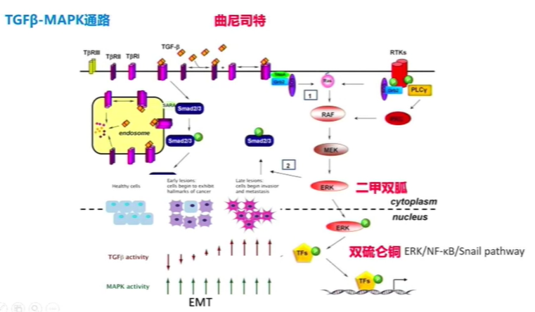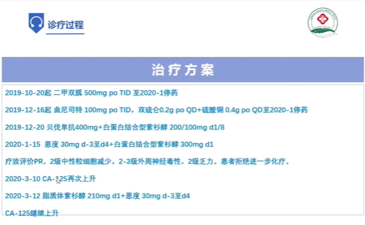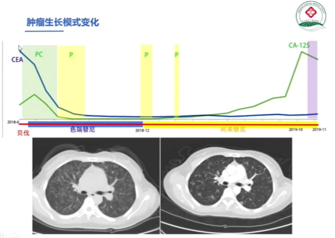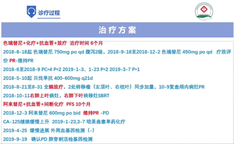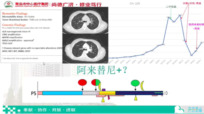 其中通过文献查阅,我们倾向于患者的MAPK通路被激活是主要的耐药机制之一,因此在ALK抑制剂的基础上,我们大胆使用了二甲双胍后续又替联合了曲尼司特以及双硫仑。最终患者的治疗过程如下