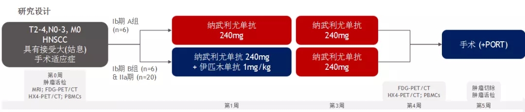 2020 ESMO年会报道了一项免疫新辅助治疗可切除HNSCC的I/II期IMCISION临床研究,32例HNSCC患者在术前接受纳武利尤单抗(第1、3周)联合CTLA-4抑制剂伊匹木单抗(第1周)的双免疫联合治疗或纳武利尤单抗(第1、3周)单药免疫治疗,第4周行CT扫描评估,第5周进行手术。研究中,Ⅳ期和复发性HNSCC患者的比例占2/3。在可评估的29例患者中,纳武利尤单抗±伊匹木单抗用于新辅助治疗的研究结果如下: