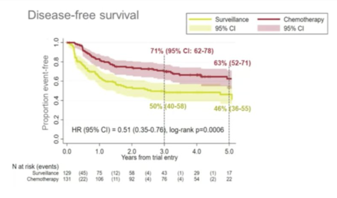 • 相较于对照组,化疗组的疾病风险降低49%(HR 0.51,95%CI:0.35~0.76;P=0.0006),3年DFS率和5年DFS分别提高21%和17%。