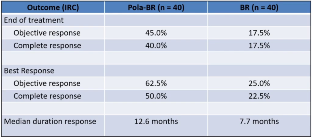 表1: Pola联合BR及单纯BR治疗R/R DLBCL的临床应答率