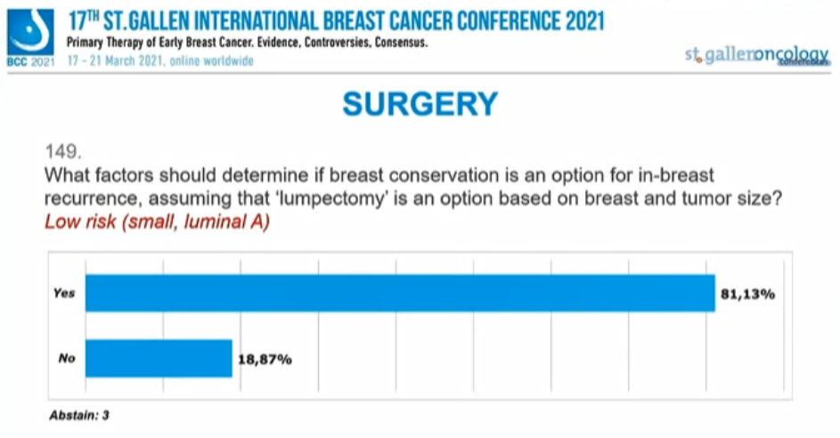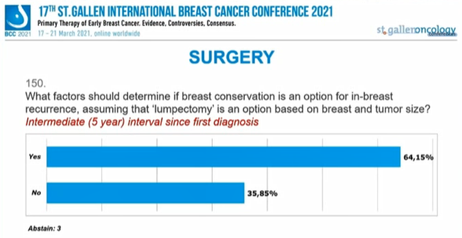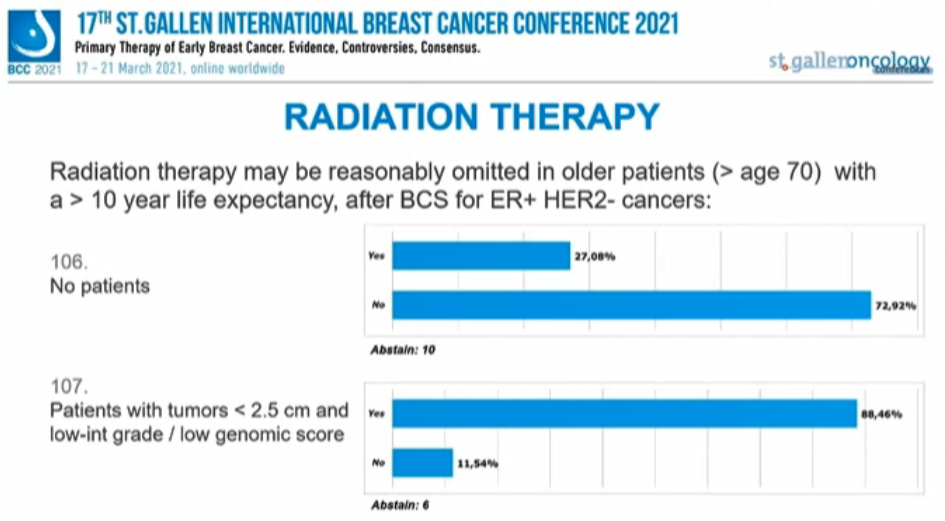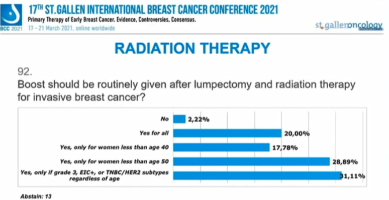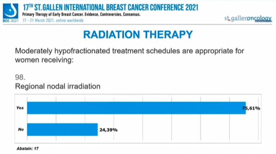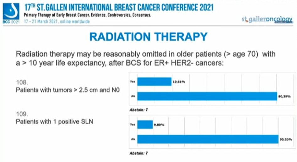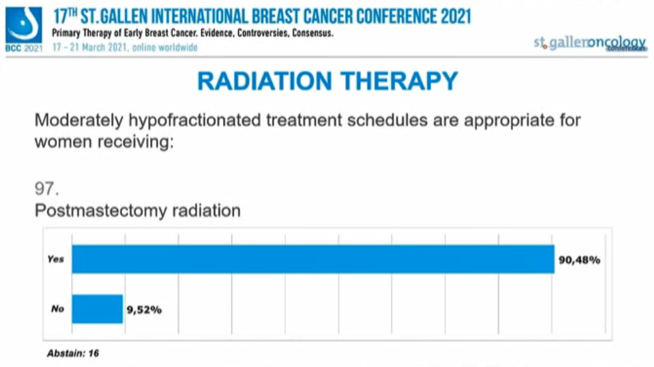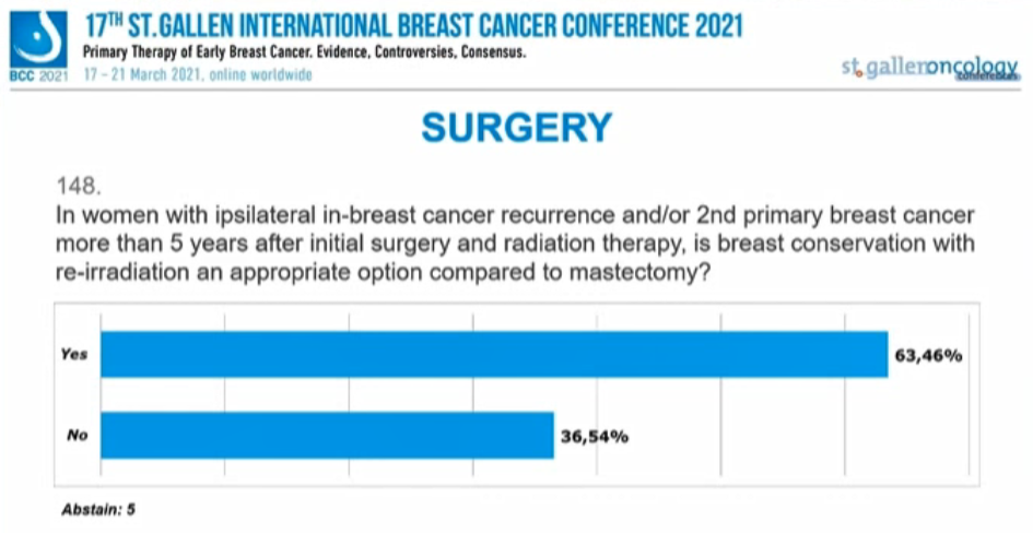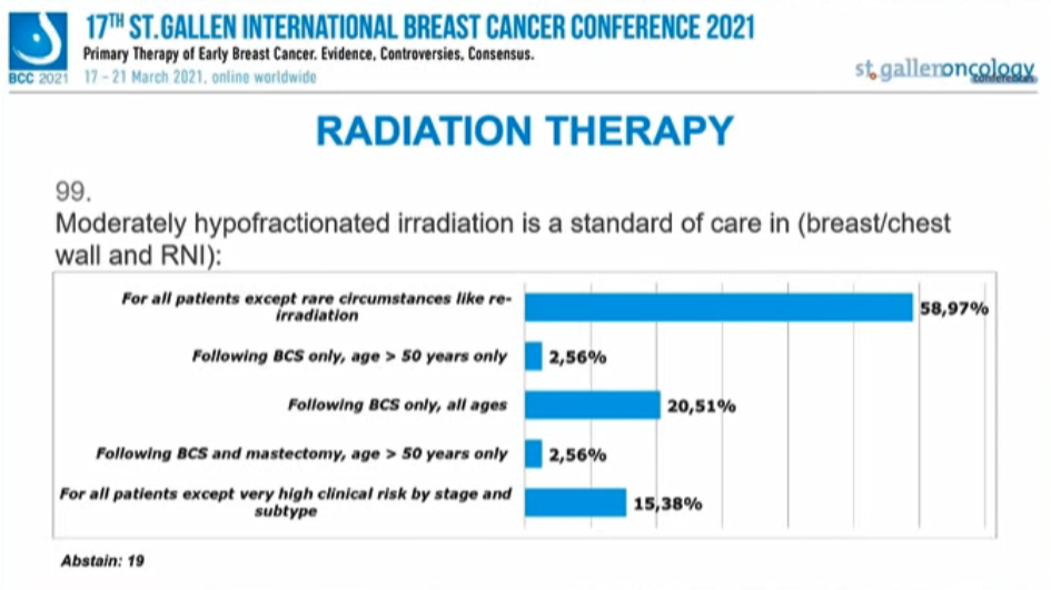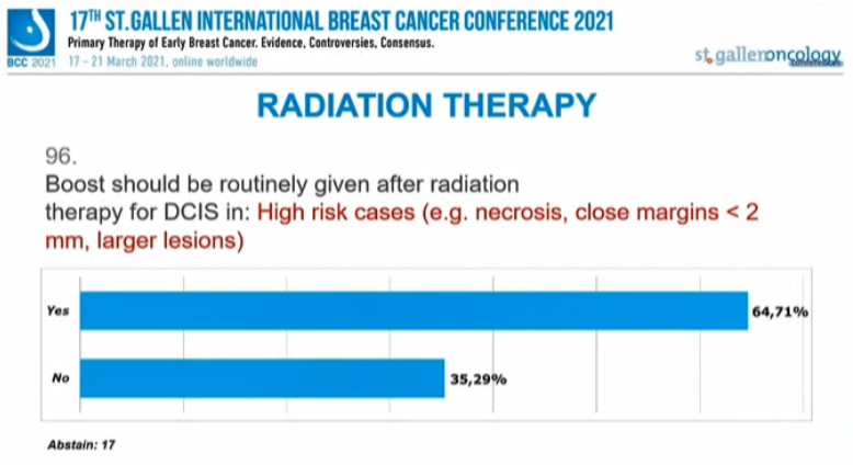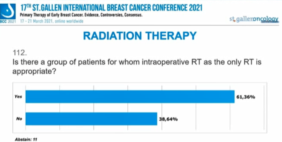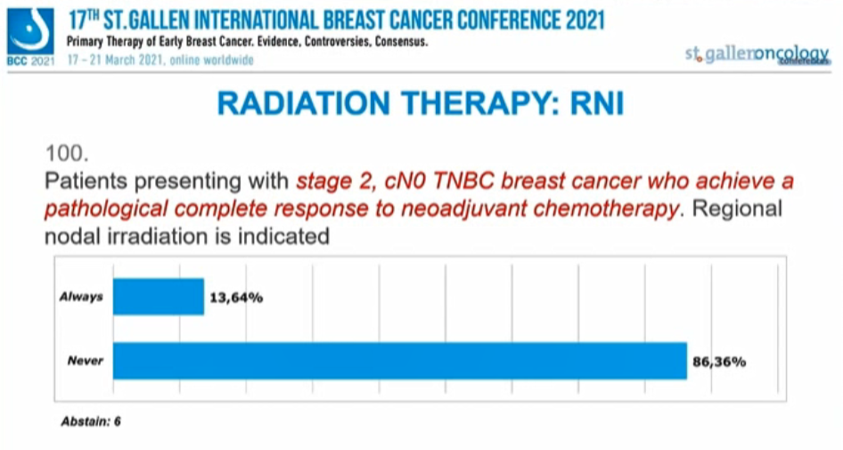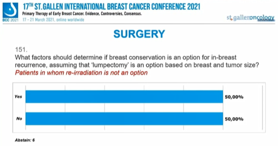 编者按:在昨天的首场SG-BCC专家投票中,已经讨论了新辅助治疗后的腋窝处理,并涉及了部分乳腺手术、放疗的内容。行至会议的第二场专家投票,也再次针对早期乳腺癌的放疗、手术治疗中的其他问题进行讨论。